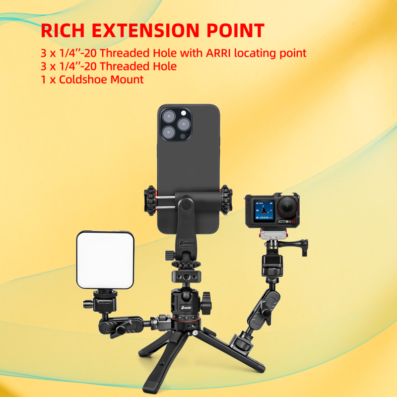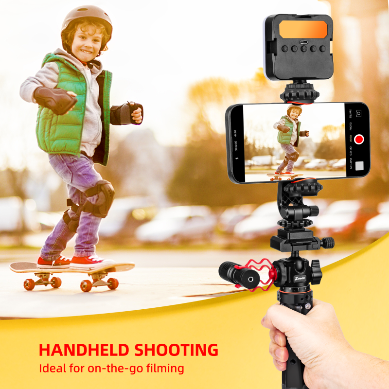 - Versatile All-in-One Design: Includes a phone clip and action camera adapter, functioning as a cell phone stand, iPhone tripod, and phone stand for recording. Ideal for vlog tripod use and as an iPhone vlogging kit, making it perfect for vloggers and content creators to capture stable shots with smartphones or action cams.