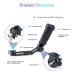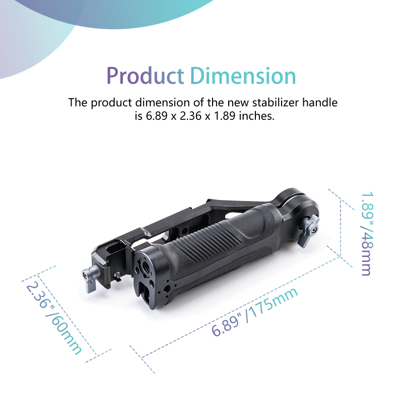 • The handgrip features multiple 1/4" and 3/8" threaded holes, locating holes compatible with ARRI pins, and two cold shoe mounts for mounting accessories, including LED lights, sound receiver, monitor, and more.