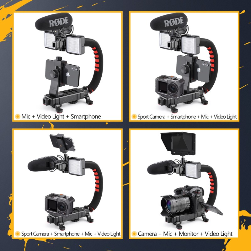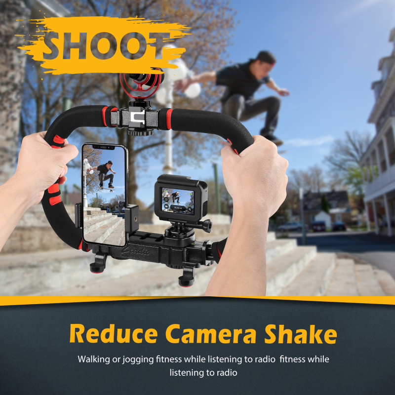 - Multifunction stabilizer with single-hand mode and both-hand mode. Holding the handles with both hands (both-hand mode) can effectively reduce the camera shake when shooting video.